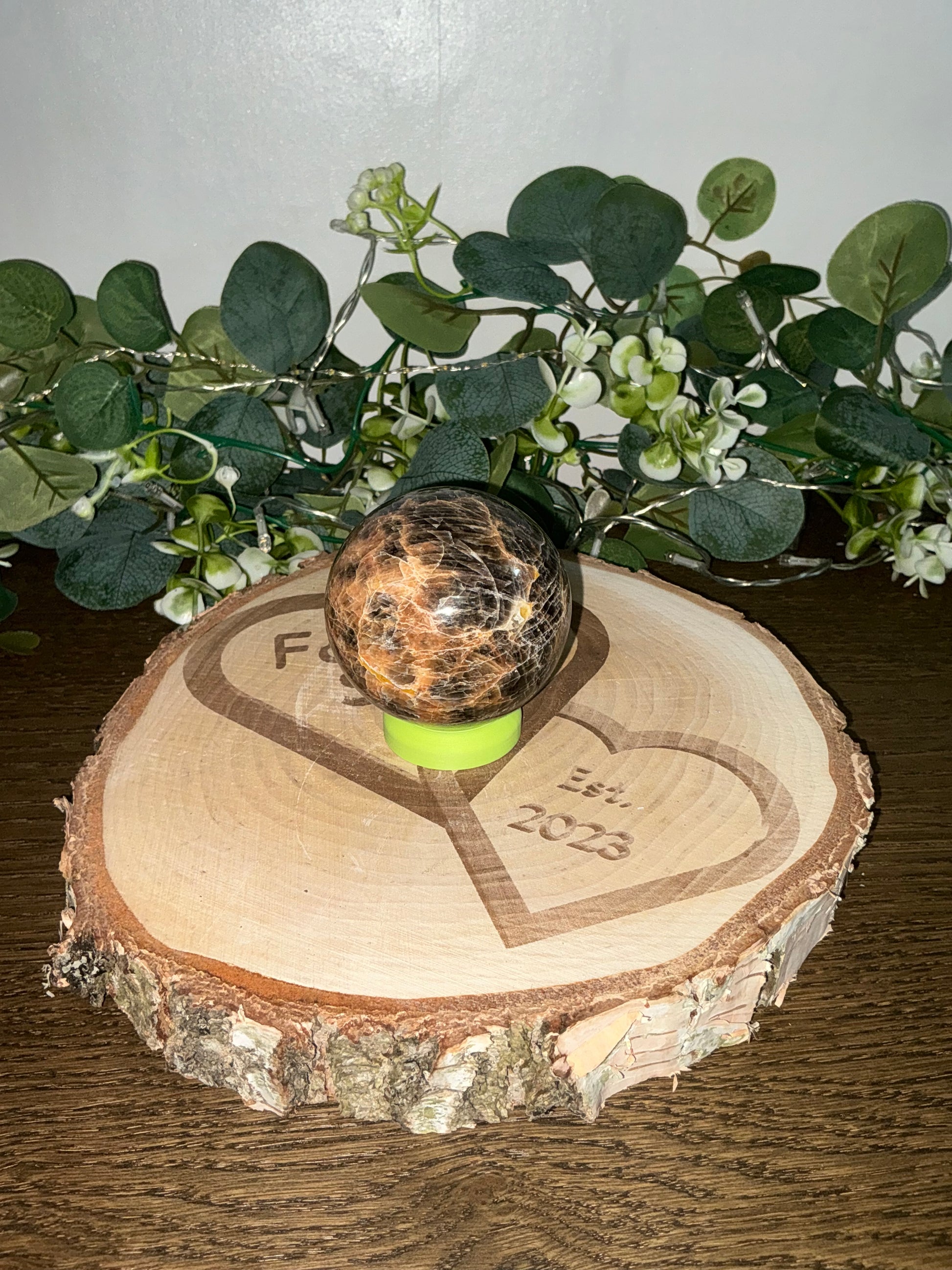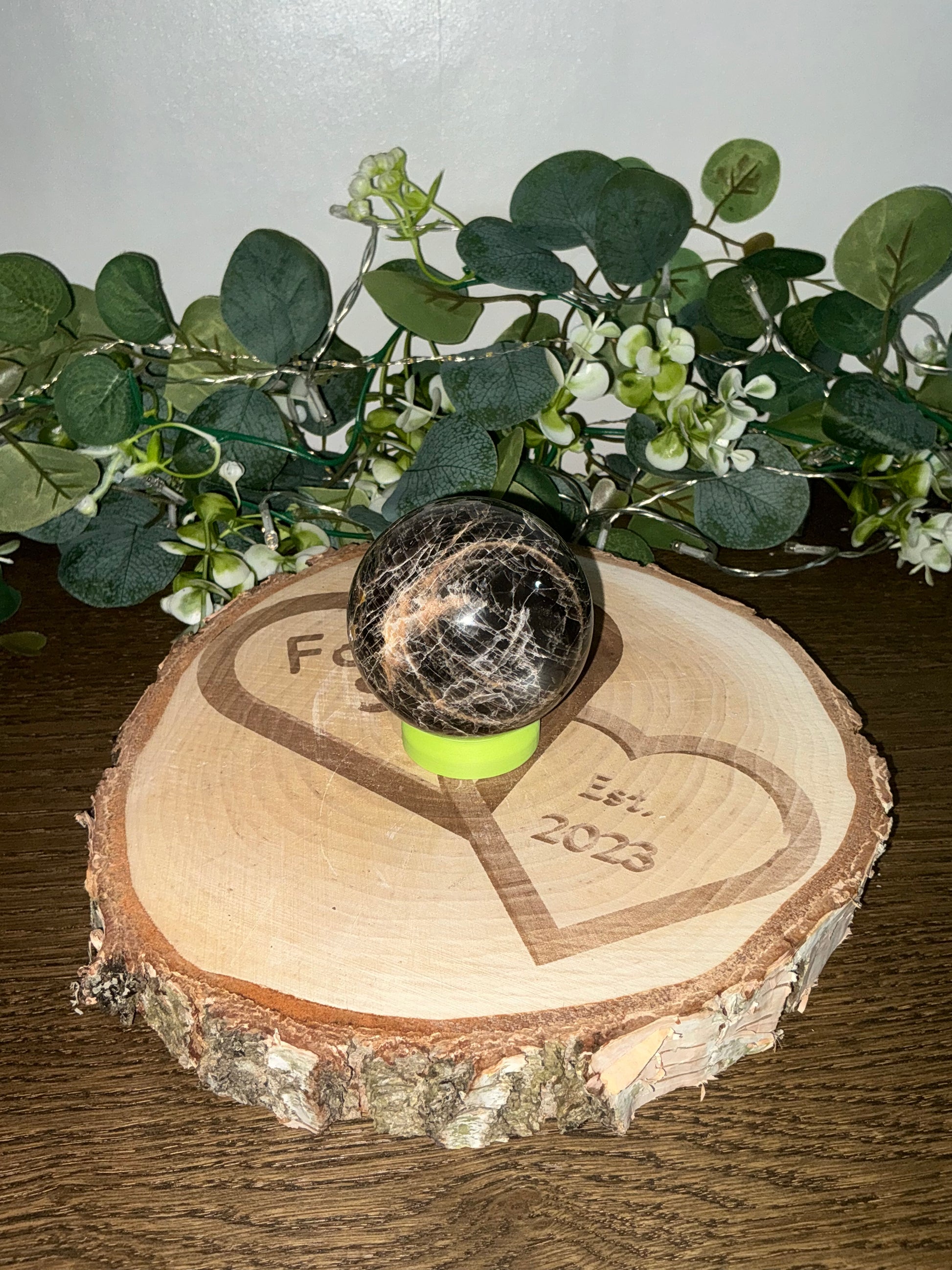 This Black Moonstone Sphere, weighing 341g, showcases deep, lustrous black hues with subtle iridescent flashes. Expertly polished to a smooth, reflective finish, it offers both aesthetic elegance and a tactile experience. Ideal for collectors and crystal enthusiasts, this sphere highlights the unique play of light characteristic of moonstone, making it a captivating piece for display or meditation.