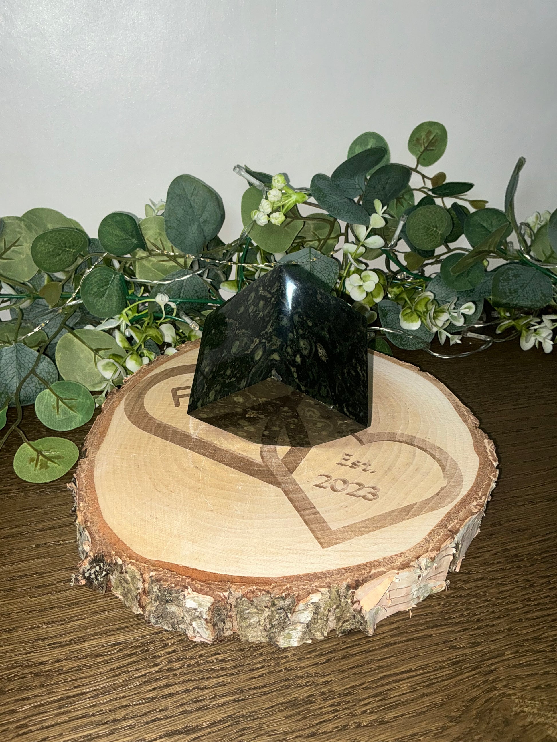 This exquisite Kambaba Jasper cube, weighing 701 grams, showcases the deep green and black swirling patterns unique to this stone. Known for its calming and grounding properties, Kambaba Jasper is prized by collectors and wellness practitioners alike. Perfect for display or meditation, this polished cube offers a tactile and visual connection to nature, enhancing relaxation and mental clarity. Its substantial size and weight make it an impressive addition to any collection or holistic practice.