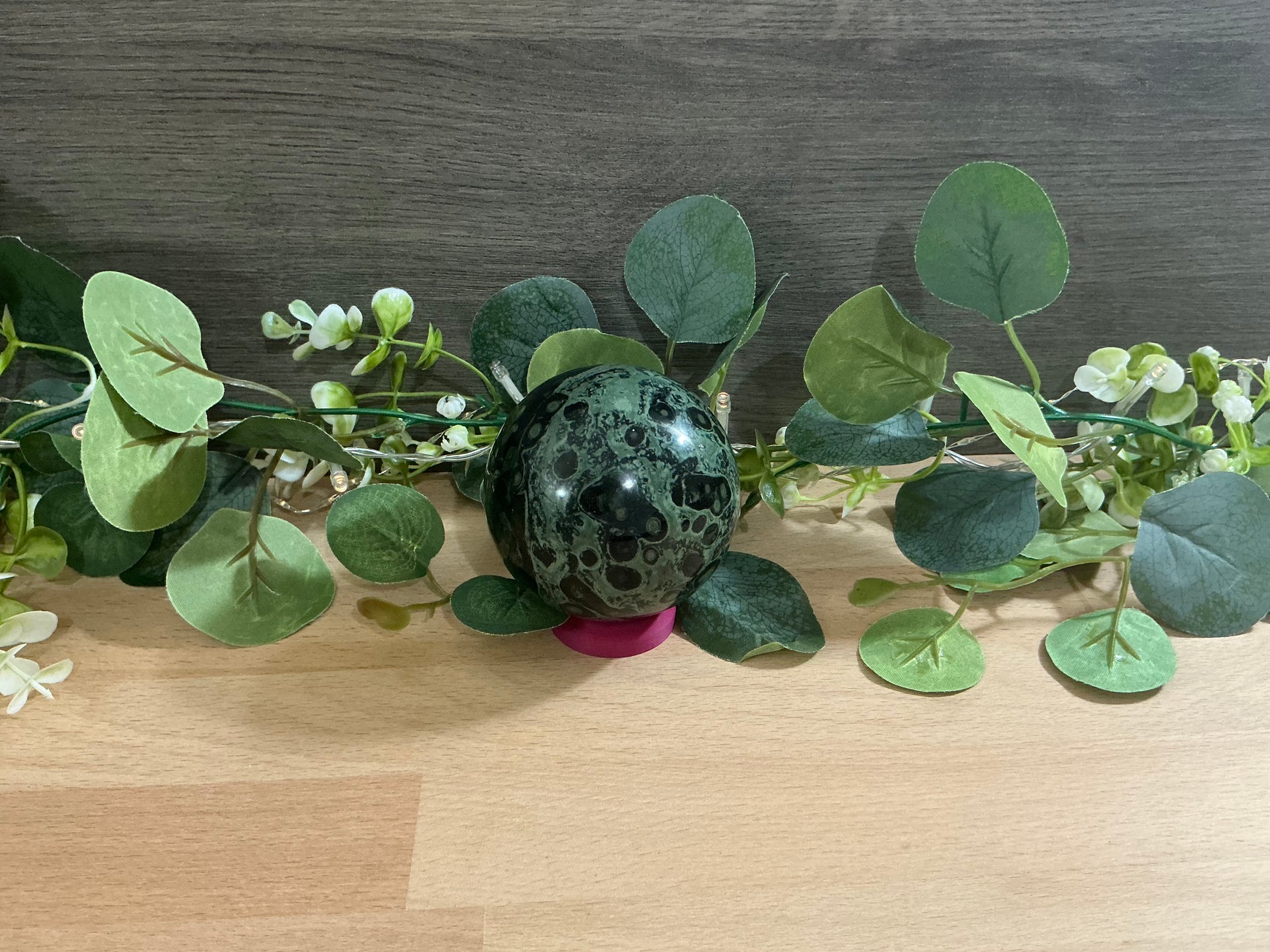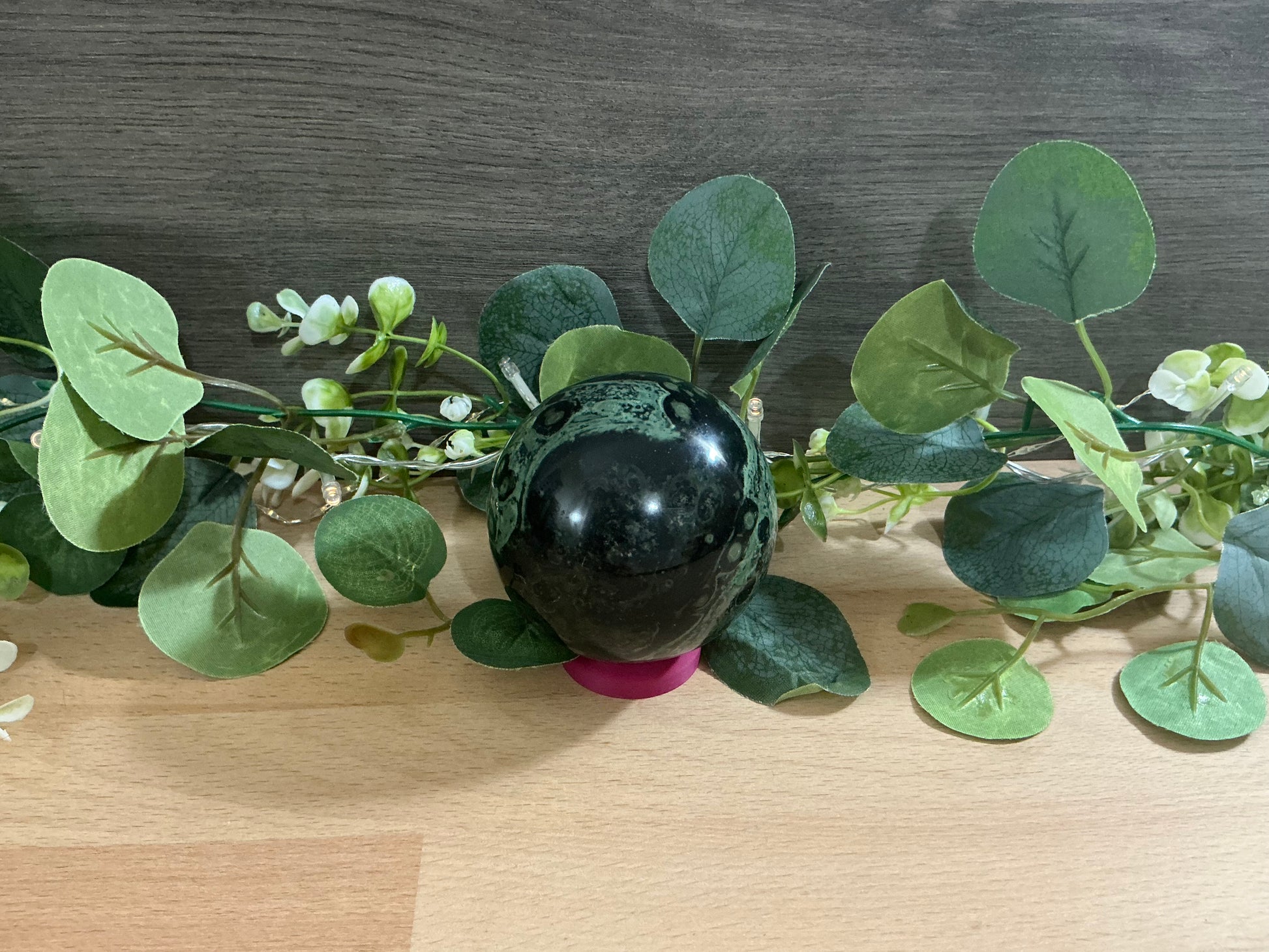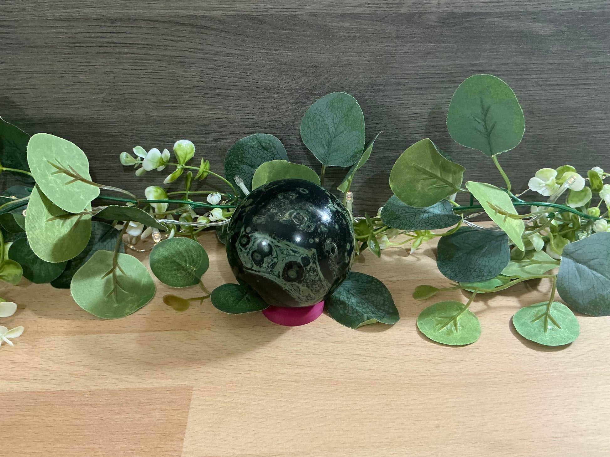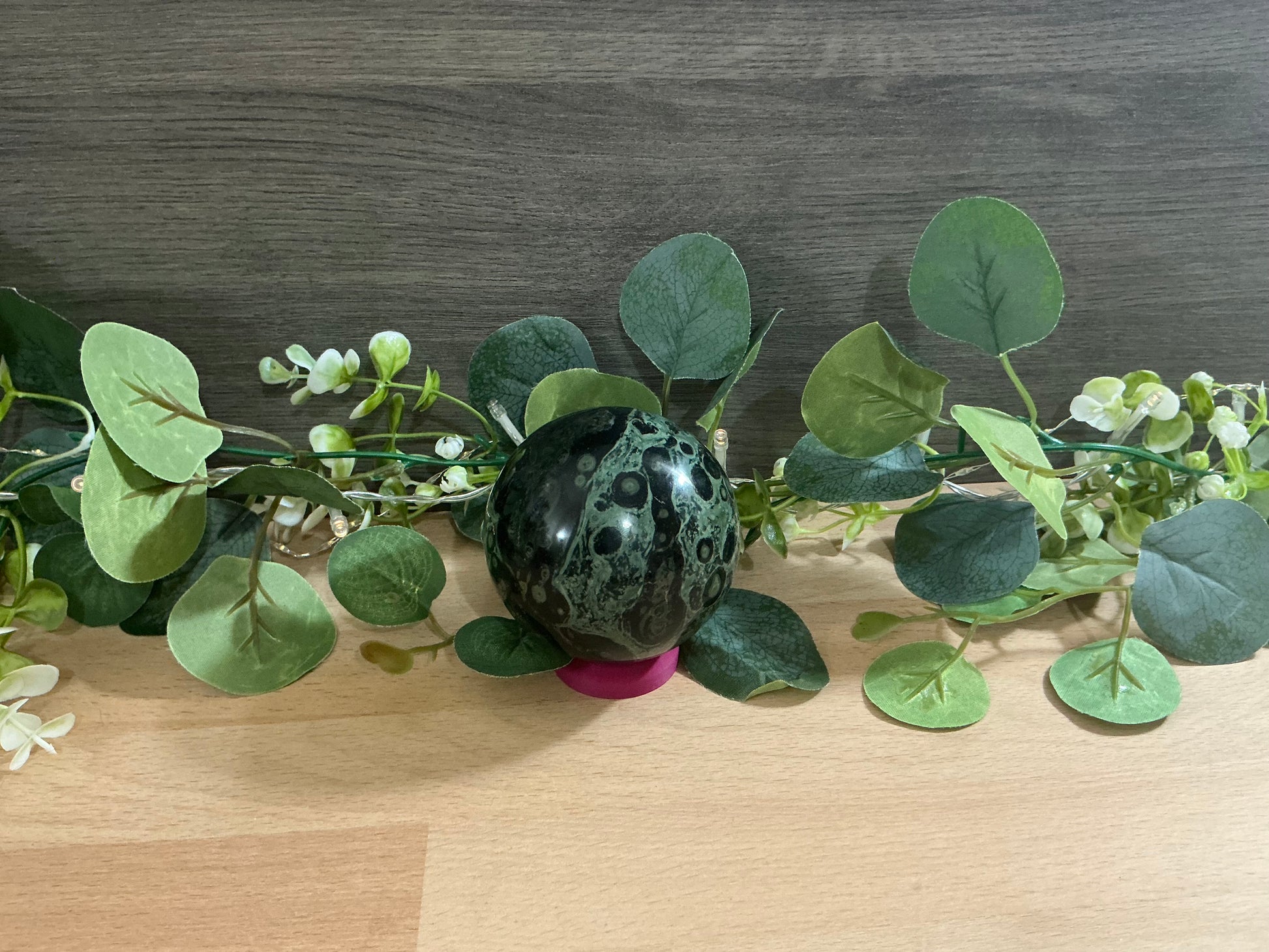 Discover the captivating beauty of the Kambaba Sphere, weighing 601g. This mesmerizing stone features unique swirling green and black patterns that bring a sense of calm and balance to any space. Perfect as a decorative piece or a thoughtful gift, its natural allure enhances your environment while inspiring tranquility and positive energy. Elevate your collection with this striking Kambaba Sphere today.