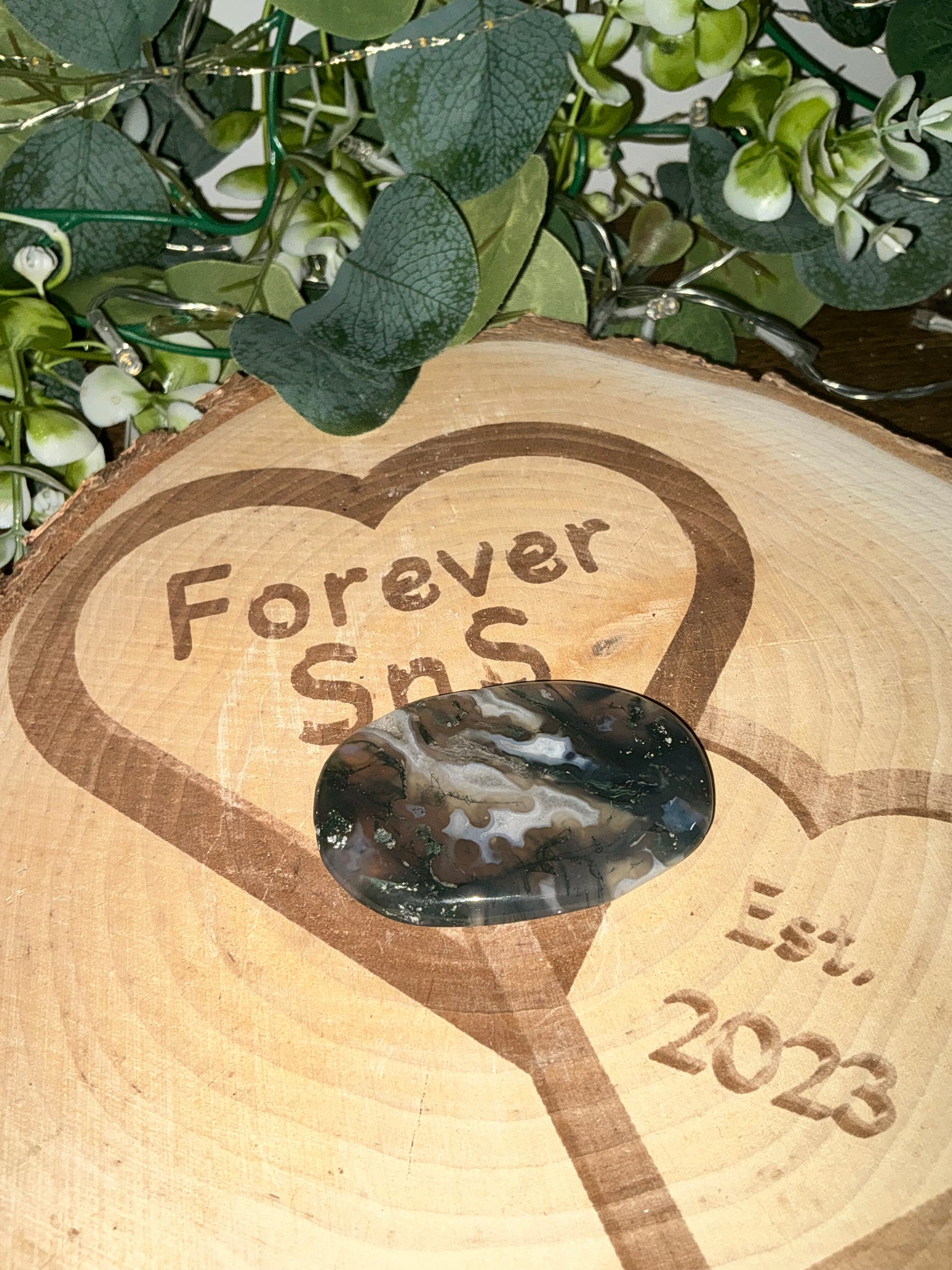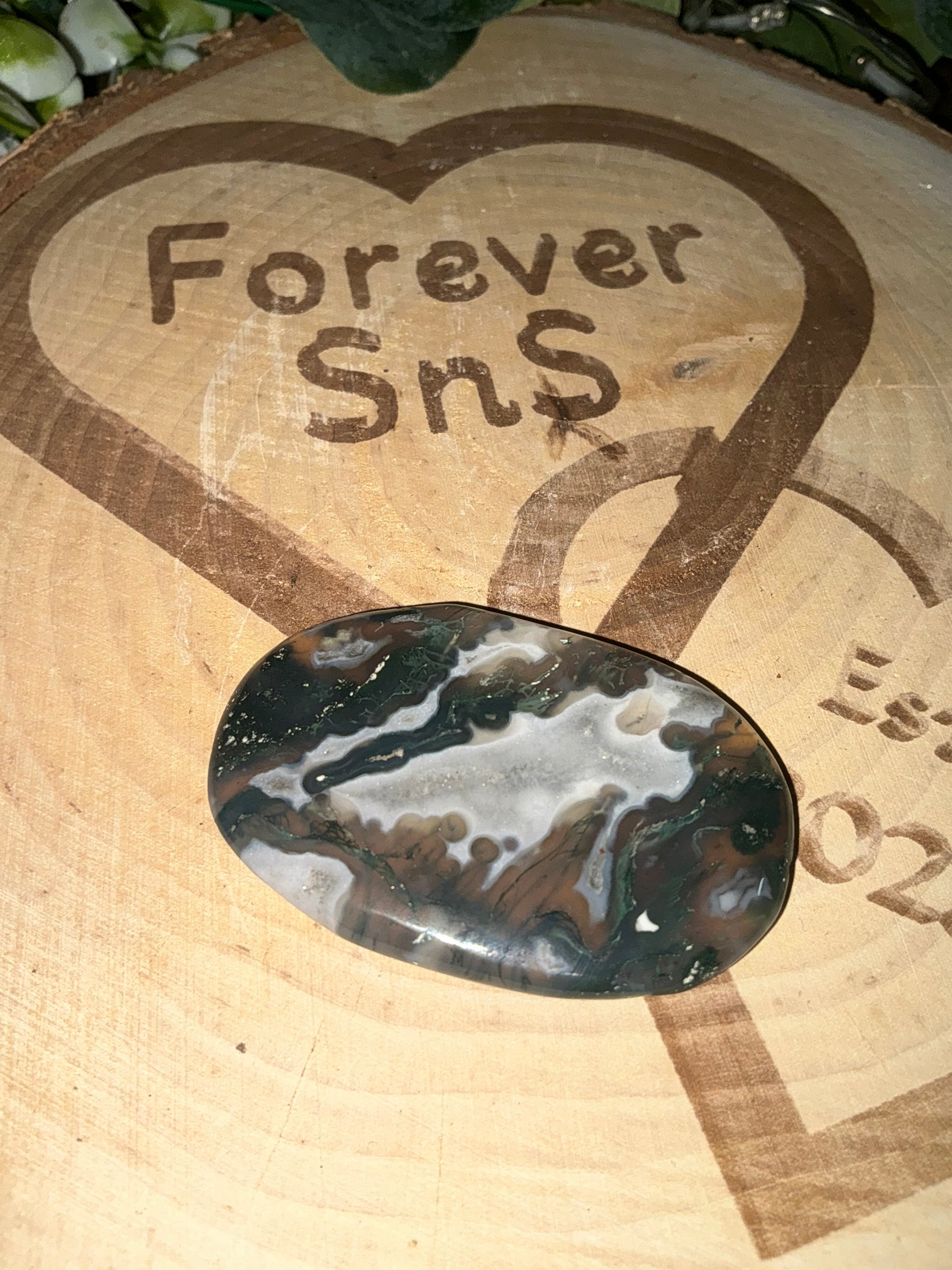 Moss Agate Palm 37g is a finely polished natural stone known for its intricate green inclusions that resemble moss. Weighing 37 grams, this piece is ideal for use in crystal healing and meditation practices, offering grounding energy and promoting emotional balance. Its smooth surface fits perfectly in the palm, enhancing tactile comfort during mindfulness sessions. This moss agate palm stone serves as a refined tool for those seeking to connect more deeply with nature and foster stability in their daily life.