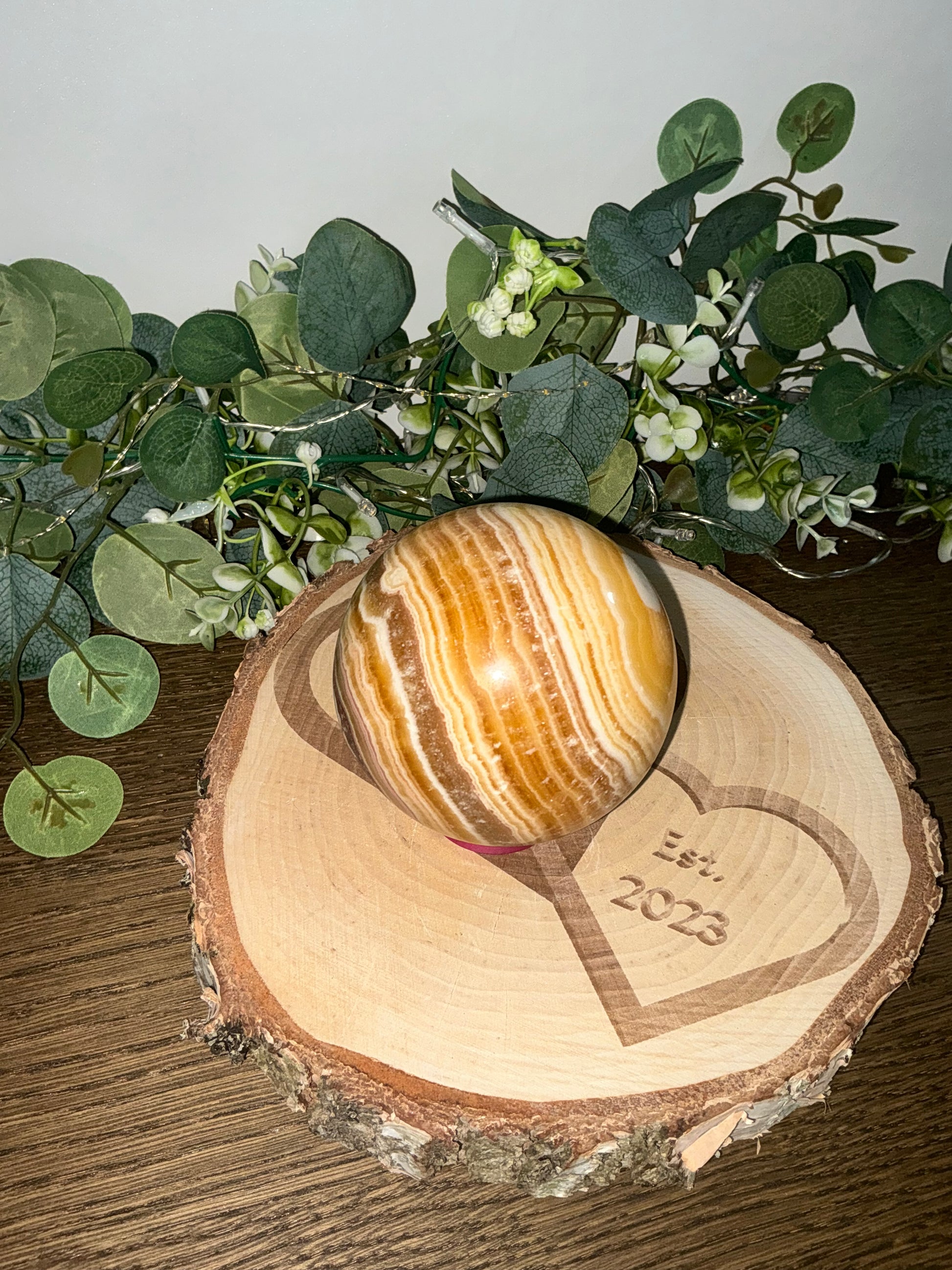 This Large 87mm Orange Banded Calcite Sphere, weighing 1001 grams, showcases stunning natural banding that highlights the vibrant orange hues typical of this mineral. Known for its calming and energizing properties, this sphere serves as a powerful tool for enhancing focus and emotional balance. Perfect for collectors and crystal enthusiasts, its polished spherical form allows for smooth handling and display, making it both a decorative and metaphysical addition to any space.