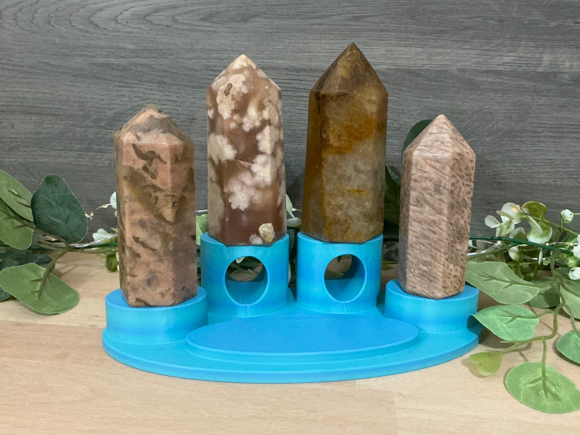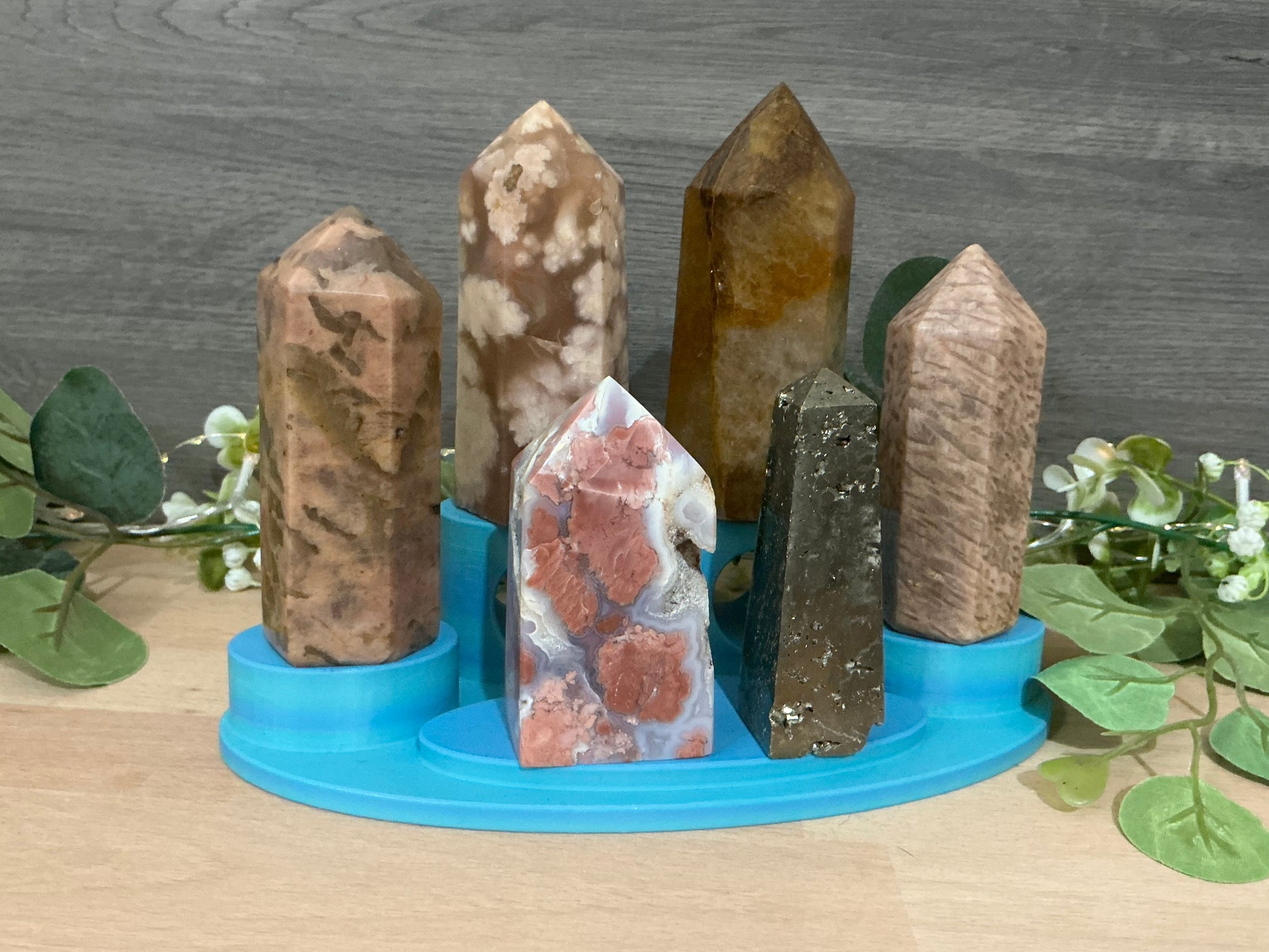 This Small Tower Display is expertly 3D printed to showcase up to six crystal towers securely in an elegant oval design. Its compact size maximizes space while offering a striking presentation, making it perfect for collectors or stores looking to highlight their crystal collection with style and stability.