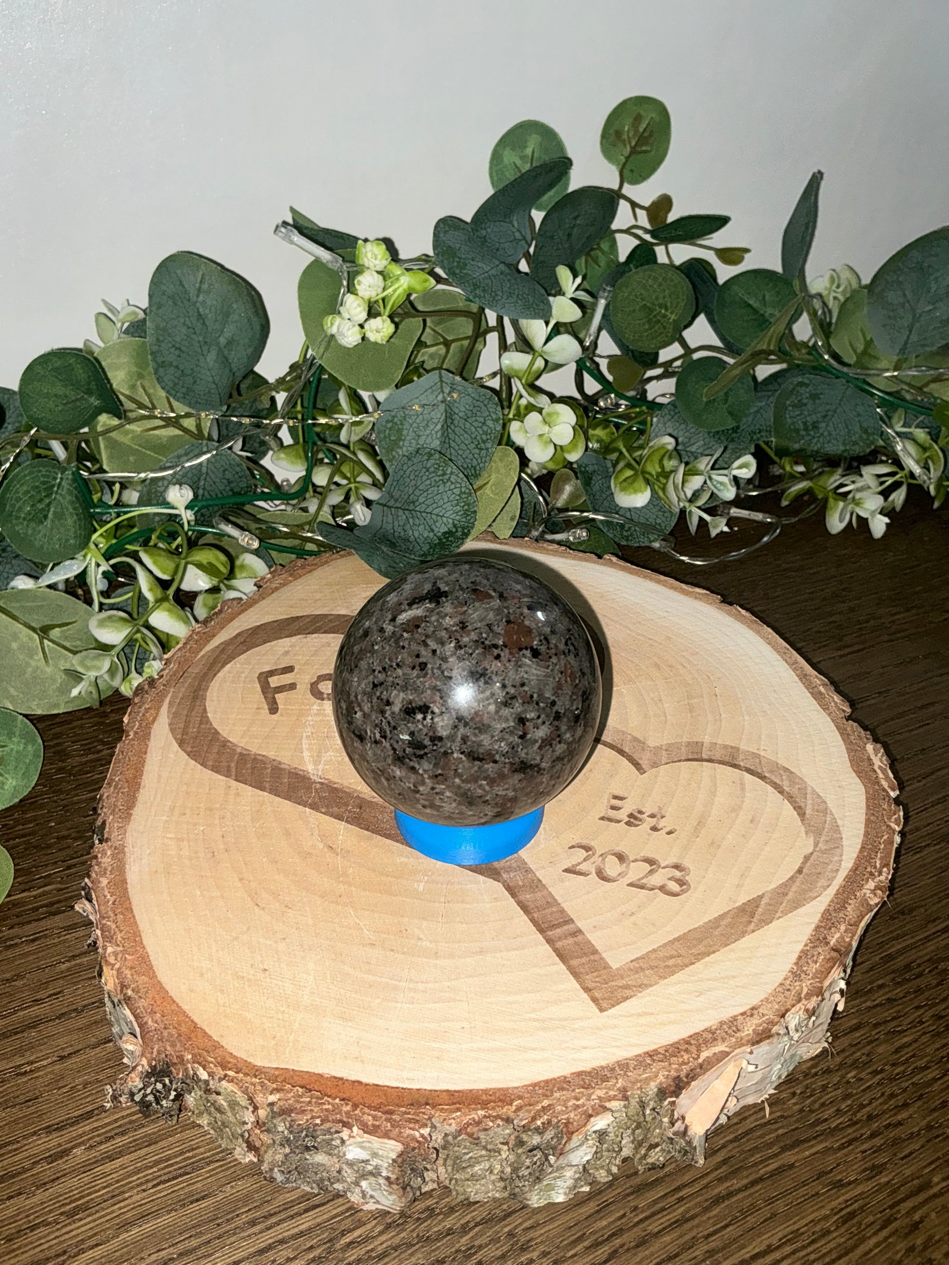This 402g Yooperlite Sphere is a captivating specimen known for its exceptional reaction to ultraviolet light. Composed of syenite rich in fluorescent sodalite, a mineral rich in sulfur impurities that emits a striking glow when exposed to UV rays, revealing intricate patterns and vibrant colors invisible in regular light. The solalite absorbs the /uv light and re-emits the energy at a lower energy level as visible light, typically bright orange or yellow. Perfect for mineral collectors and scientific enthusiasts, it demonstrates the remarkable properties of Yooperlite stones while serving as a visually impressive display piece.